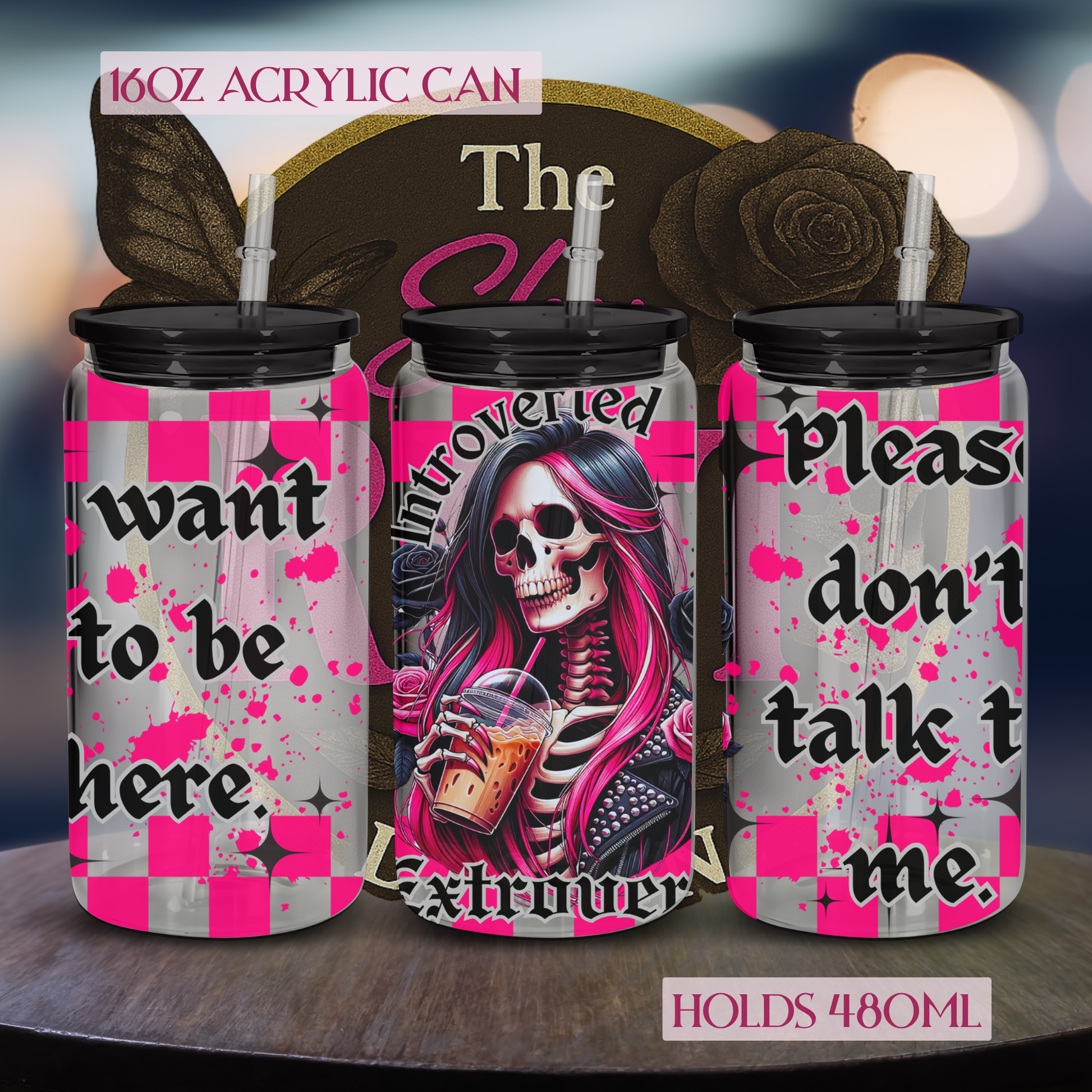For the socially exhausted who still somehow look fabulous. This acrylic can screams βI showed up. Barely.β Complete with a bold skeleton design, neon pink attitude, and just enough sarcasm to keep strangers at bay.