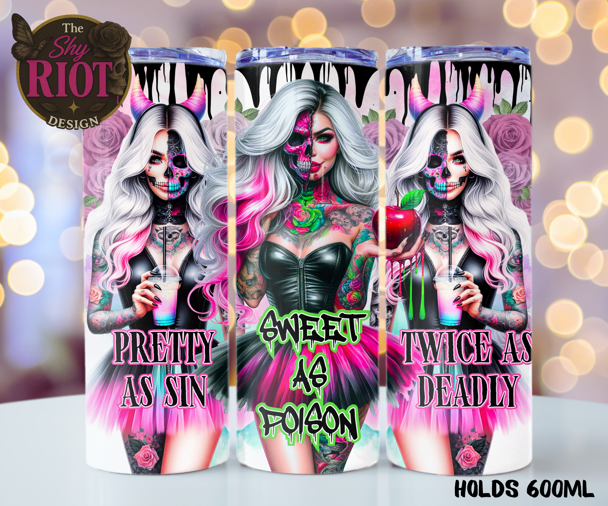 This 20oz stainless steel tumbler isn’t for the faint of heart—she’s all pink pout and deadly punch. Featuring a wickedly bold triple-panel design with the phrases Pretty As Sin, Sweet As Poison, and Twice As Deadly, she’s made for the babes who mix charm with chaos and sip like a certified villain.