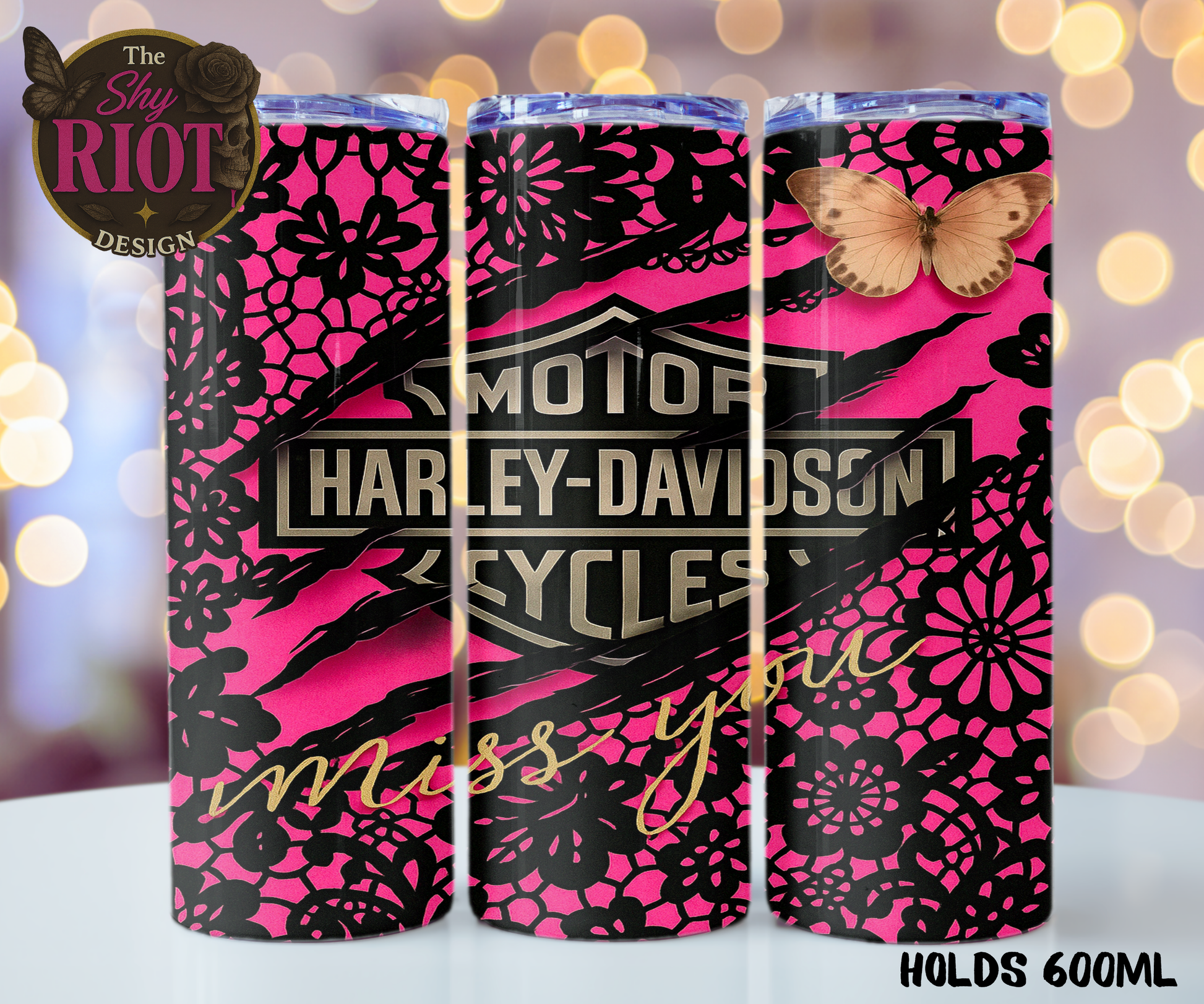 Wrapped in hot pink sass, badass lace, and just the right amount of Harley-Davidson attitude, this 600ml insulated tumbler says “I’ll burn rubber before I beg.” The “miss you” scribble? It’s giving mourning chic—because even rebels have soft spots (usually hidden under leather and sarcasm).