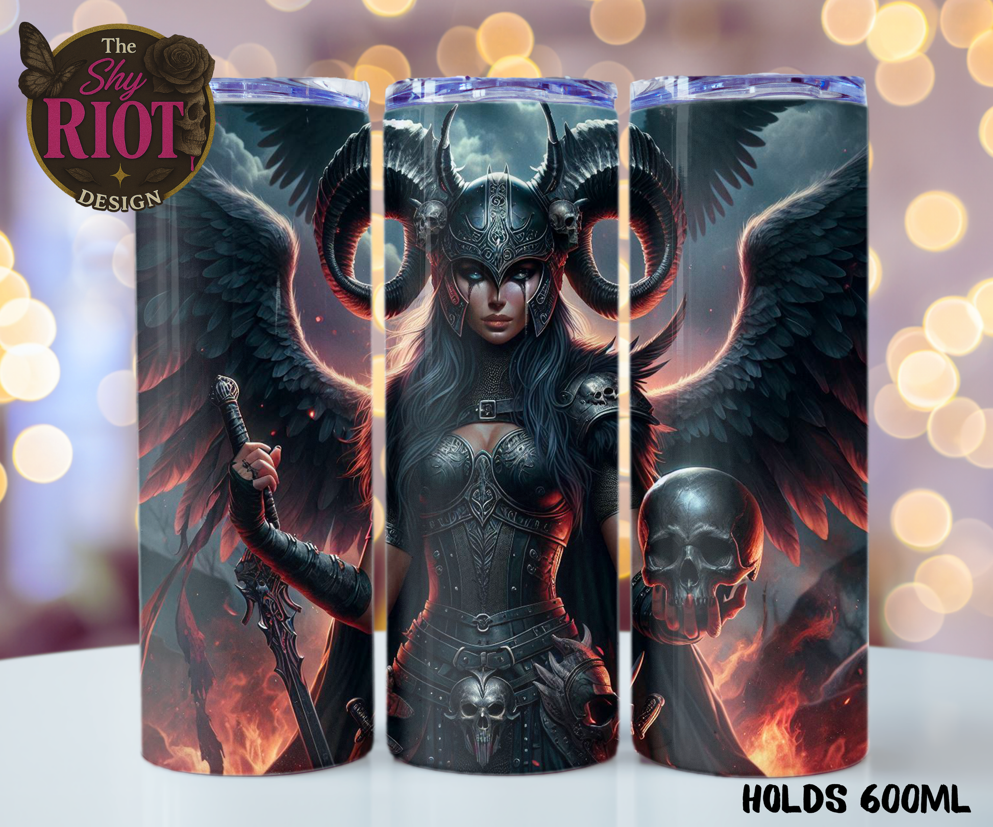 Featuring a dark goddess ready to drag the patriarchy to the underworld, this tumbler fits snug in your cup holder and your villain era. Skull-adorned, sword-swinging, and unapologetically powerful.