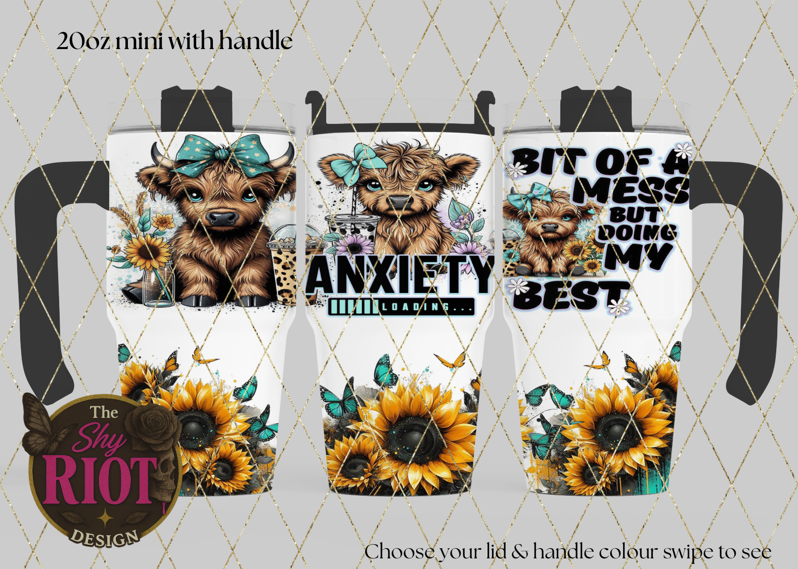 This adorable little hot mess of a tumbler is here to say what we’re all thinking but too distracted to finish saying—“Bit of a mess, but doing my best.” Featuring the cutest bow-wearing Highland cow, bold sunflower vibes, and just enough sarcasm to keep the mental breakdowns spicy.