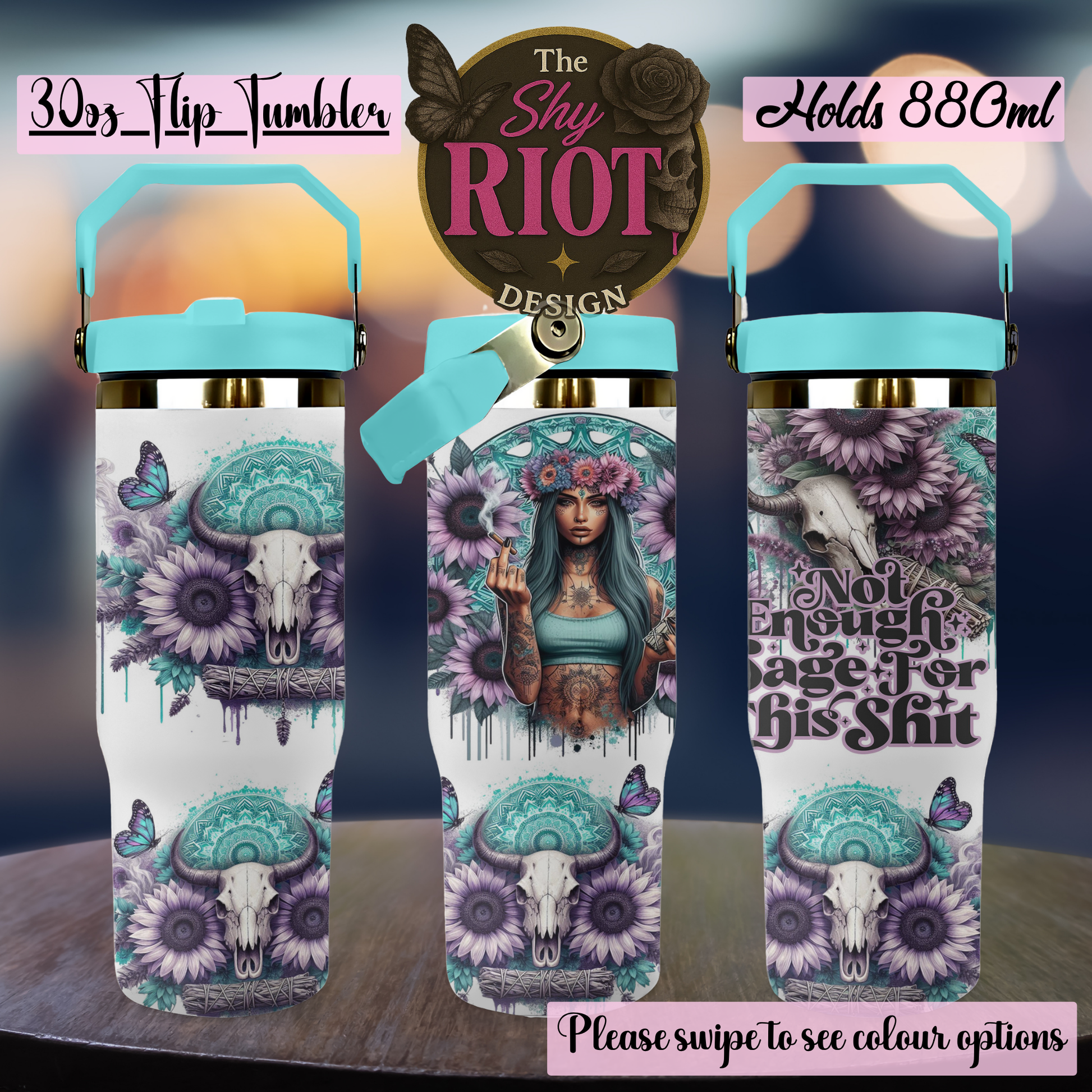 This 30oz flip-top tumbler is for the woo-woo warriors who meditate, manifest, and will absolutely cuss you out with moonstone in hand. Featuring floral skulls, mandalas, butterflies, and one heavily tattooed goddess who is done with your crap—this insulated stainless steel beauty holds 880ml of pure protective energy (or espresso, whichever works faster).