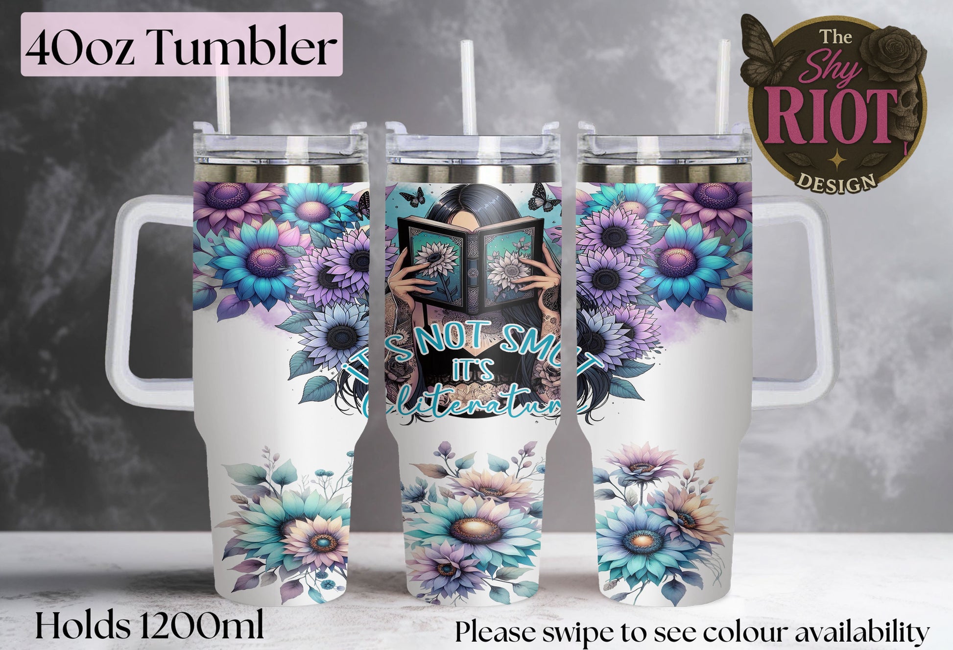 For the bookworms who know exactly what kind of “plot” they’re here for. This 1.2L tumbler isn’t just a cup — it’s a public service announcement with extra spice. Featuring moody purples, bold teal blooms, butterflies, tattoos, and a leading lady who clearly DGAF what you think she’s reading.