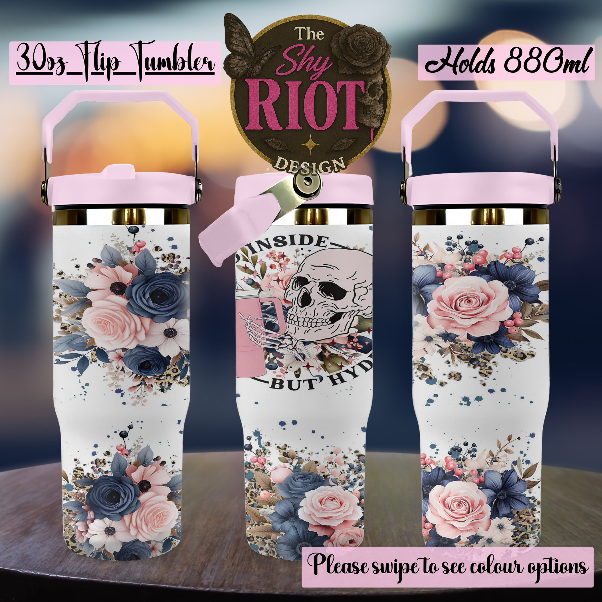This 30oz flip-top tumbler is for the sarcastic souls who run on iced coffee, intrusive thoughts, and self-deprecating humour. Featuring soft blush florals, moody navy blooms, and a skeleton bestie clutching their drink like it’s the last thread holding them together—this tumbler is your emotional support vessel.