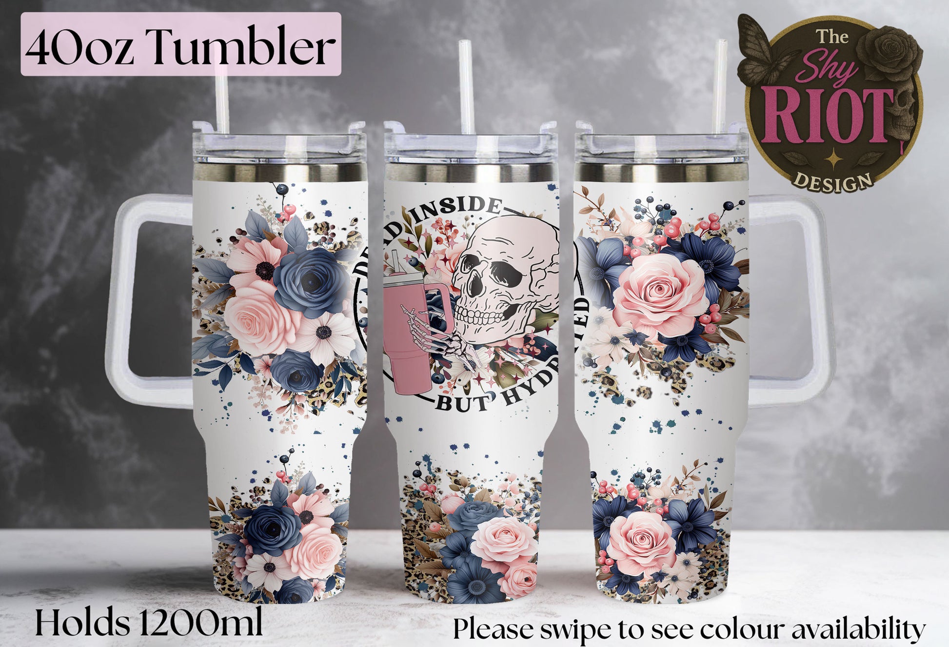 Because no matter how emotionally wrecked you feel, at least you’re getting your daily water intake. This 1.2L dark humor gem features pastel florals, leopard accents, soft pinks, navy blooms, and a skeleton who fully understands your vibe: dead inside, but thriving on caffeine and sarcasm.