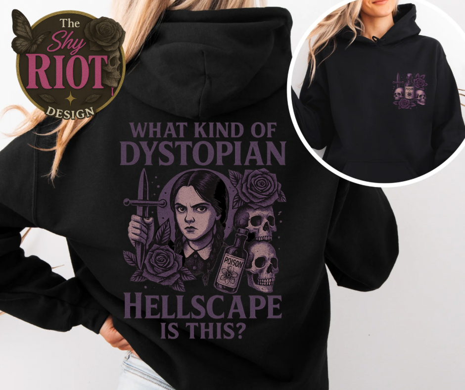 Welcome to the timeline where sarcasm is survival and chaos is the new black. This unisex hoodie doesn’t just make a statement—it starts a whole damn revolution. Featuring our darkly illustrated Wednesday-inspired design (complete with dagger, poison, and skulls because, obviously), this piece screams “I didn’t choose the doomscroll life, the doomscroll life chose me.”
