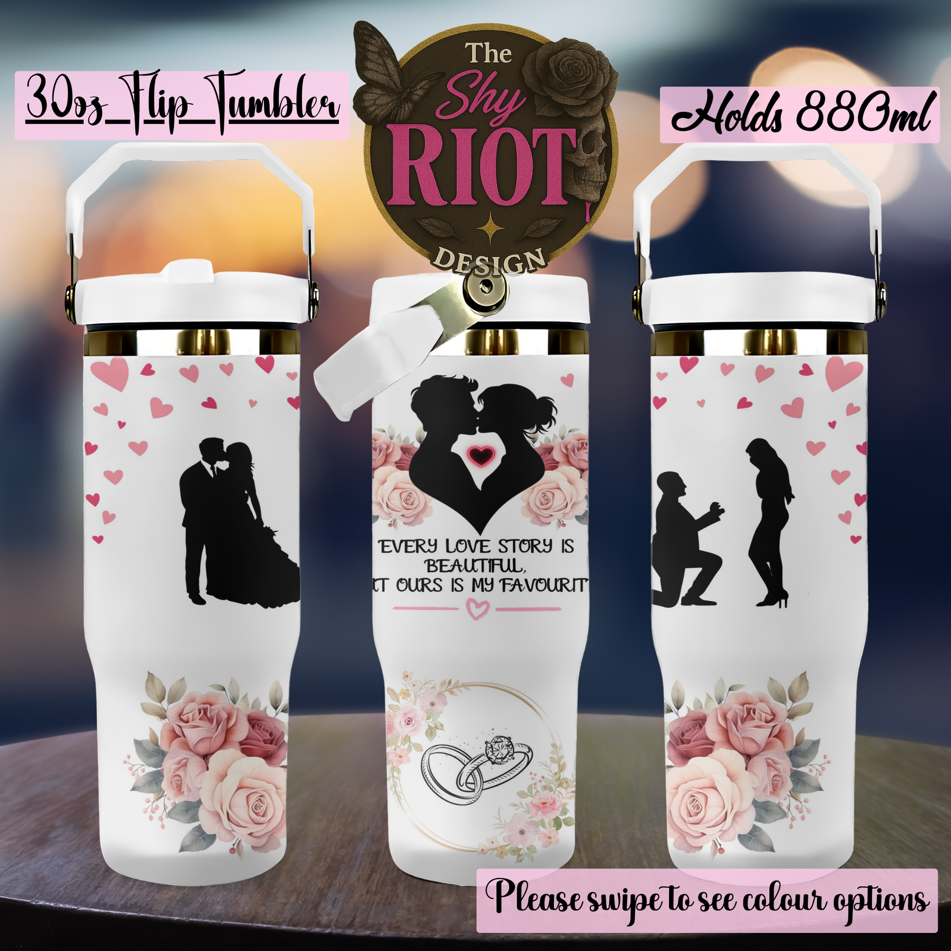This 30oz flip-top tumbler is the perfect tribute to your favourite “we survived everything together” kind of love. With sweet silhouettes, blush roses, engagement rings, and a quote that’ll make even the most cynical goths pause, it’s ideal for anniversaries, proposals, or just reminding your person they’re stuck with you forever.