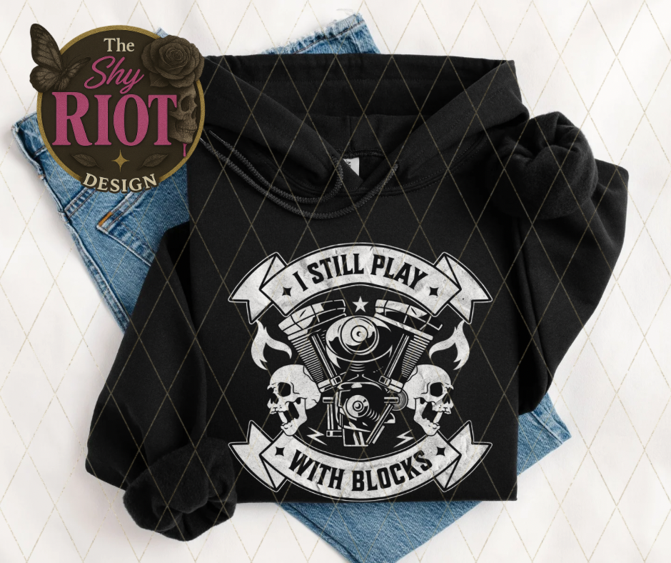 This unisex, oversized hoodie is built for those who’d rather be wrenching. Featuring a bold skull-and-engine graphic with the iconic “I Still Play With Blocks” banner, it’s the perfect fit for anyone who knows their way around horsepower and doesn’t mind getting their hands dirty.
