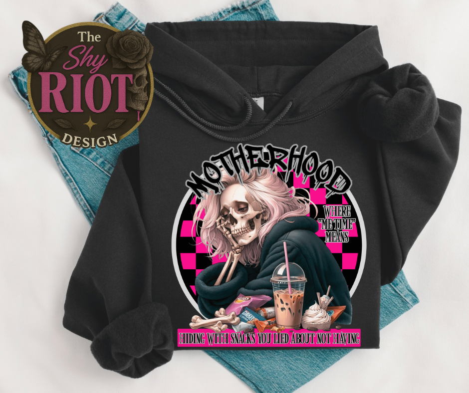 Because motherhood isn’t all sunshine and Pinterest crafts—sometimes it’s hiding in your hoodie with snacks you “don’t have” and praying nobody finds you. Featuring a sleep-deprived skeleton mum wrapped in the universal armour of exhausted warriors everywhere: a hoodie, a caffeine hit, and zero shame.
