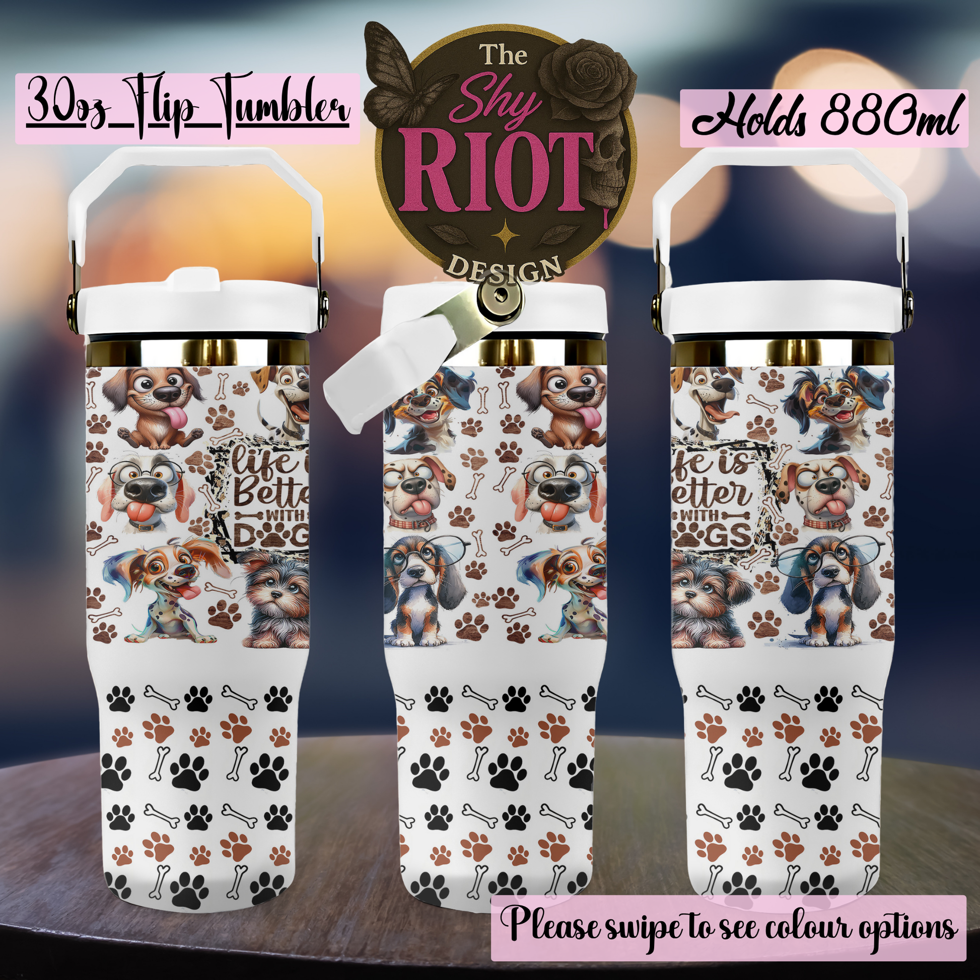 This 30oz flip-top tumbler is your official badge of dog-parent honour. Featuring a parade of floppy ears, snoots, wagging tails, paw prints, and puppy-dog eyes that could get away with literal murder—this is the tumbler for anyone who’s ever baby-talked their way through a vet visit or shared a snack “just this once.”