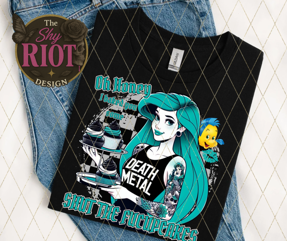 Sweet as frosting, sharp as a dagger—this tee serves fresh-from-the-oven sass with a side of don’t-mess-with-me. Featuring your favorite tattooed sea witch in a death metal tank and a tray of attitude-filled cupcakes, it’s perfect for anyone who bakes with love and bites with sarcasm. Shut the f*cupcakes, darling—it’s time to wear your chaos like a crown.