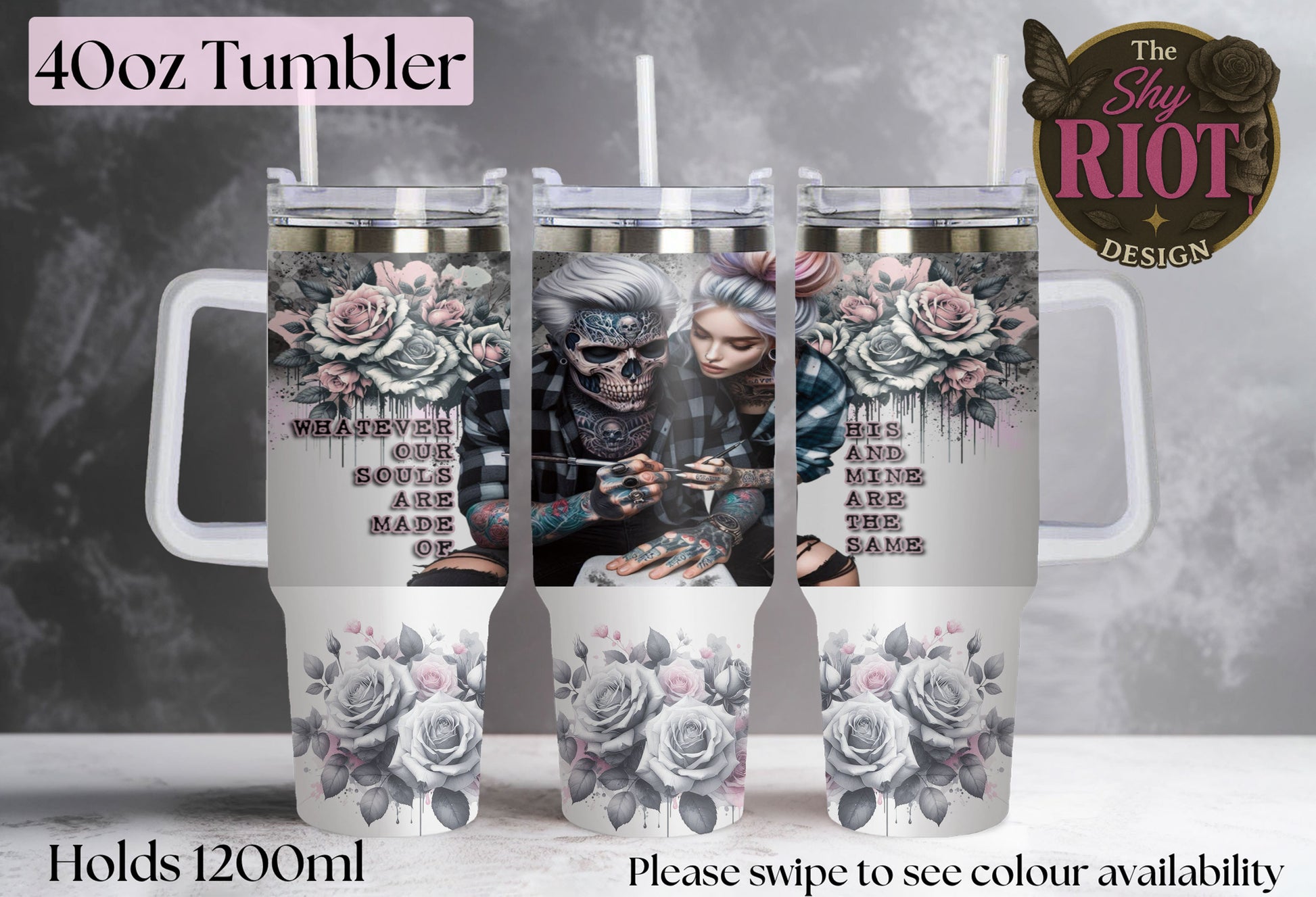 For the twisted souls who found their perfect match in the chaos. This 1.2L gothic romance piece blends skeleton inked lovers, grunge flannel, soft grey & blush roses, and that unmistakable ride-or-die energy. Because love isn’t always soft — sometimes it’s beautifully intense.