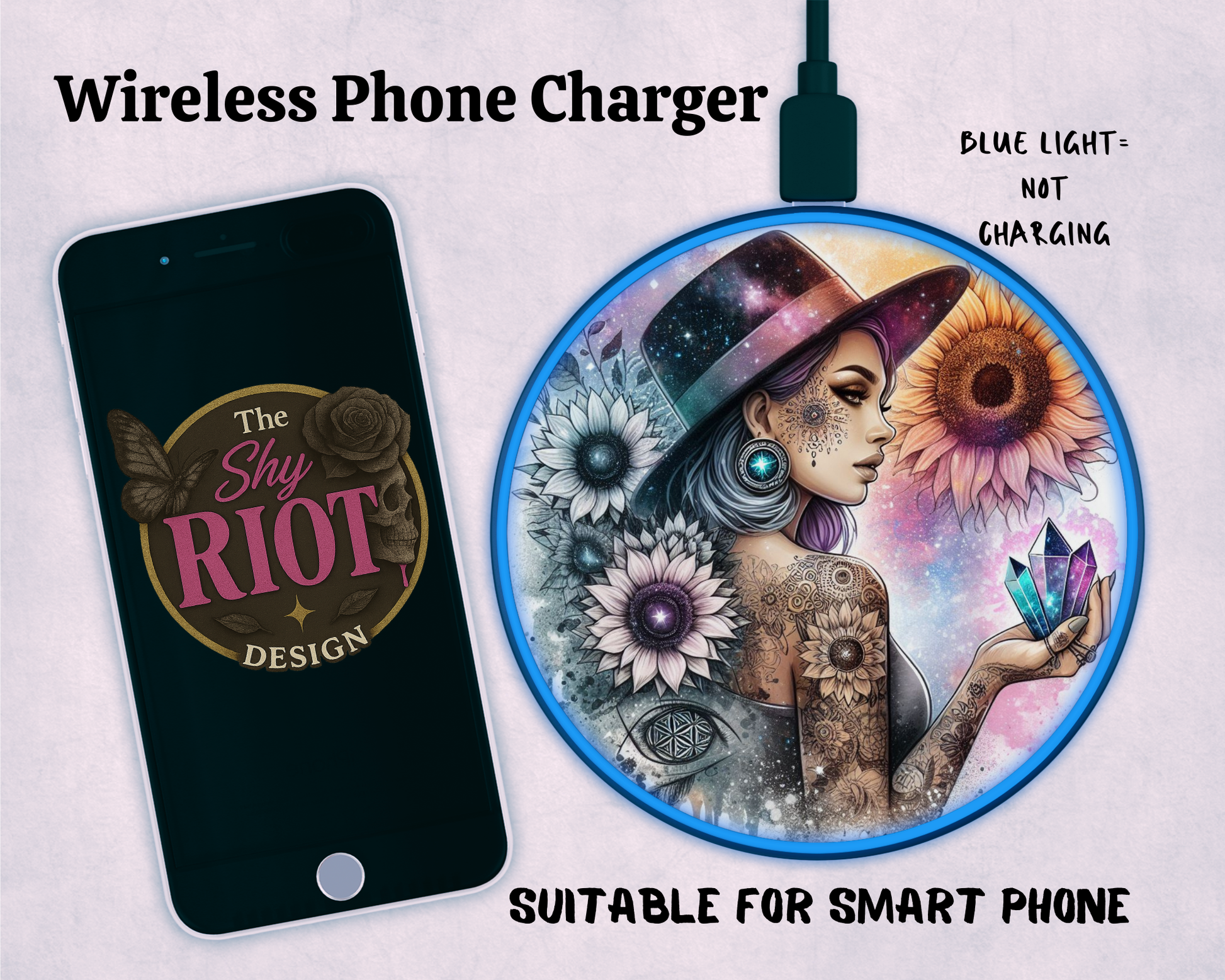 She’s not just vibing — she’s vibrating on a whole other frequency. With celestial florals, radiant crystals, and inked-up cosmic energy, Spellbound Glow turns every charge into a ritual. This isn’t just tech — it’s witchcraft with a USB port.